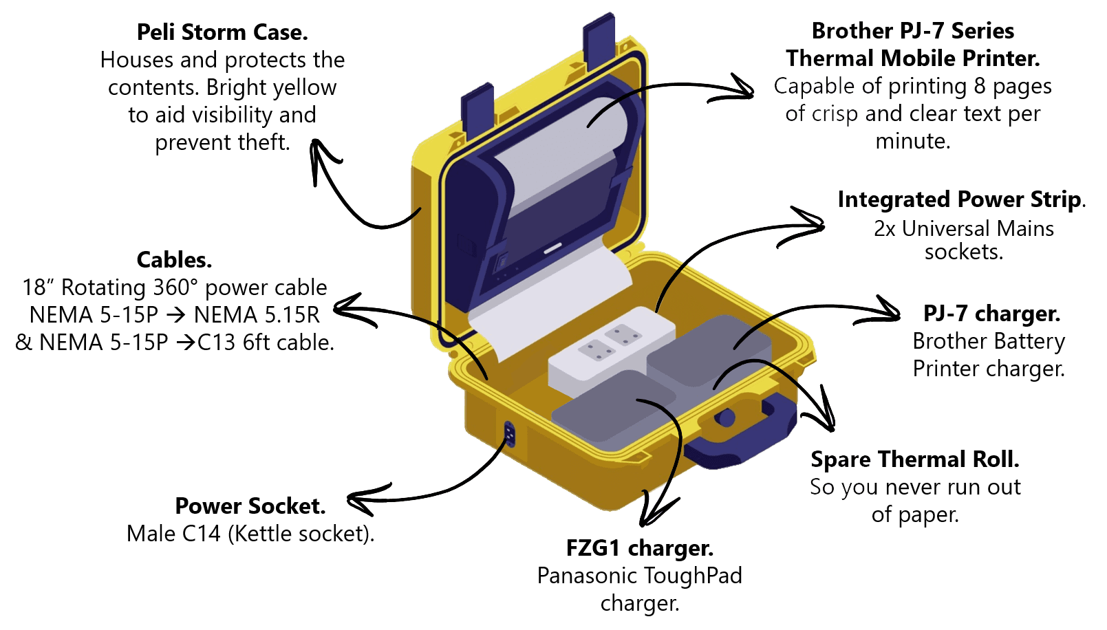 For our preferred hardware, the Panasonic ToughPad, we have integrated charging into the Charging and Printer Kit. This is designed to be plugged into the aircraft 115V AC supply in the cockpit (aka the Hoover socket).