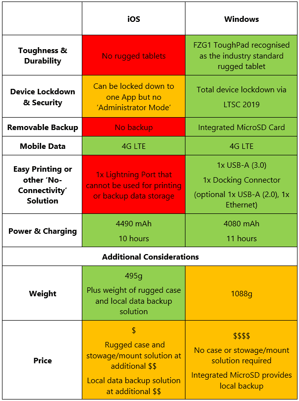 This is a question that comes up in nearly every demo, every webinar and every proposal we’ve ever done at Conduce. eTechLog8 is available on both iOS and Windows (and it is identical on both platforms), but to date our customers worldwide have unanimously chosen to host eTechLog8 on Windows devices; more specifically, the Panasonic FZG1 ToughPad. We’ve looked at the key considerations when choosing ELB hardware below.